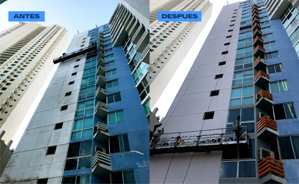 Se realizo:Se ejecutó un proceso completo de preparación de superficie, que incluyó la aplicación de tratamiento antihongos para prevenir la proliferación biológica, reparaciones de fisuras con Liquid Rubber A205 para asegurar una solución duradera y flexible, pintura de acabado, sellado con silicona en ventanas, mantenimiento de la carolina e instalación de wallcaps, como parte de las mejoras estructurales y estéticas del edificio.